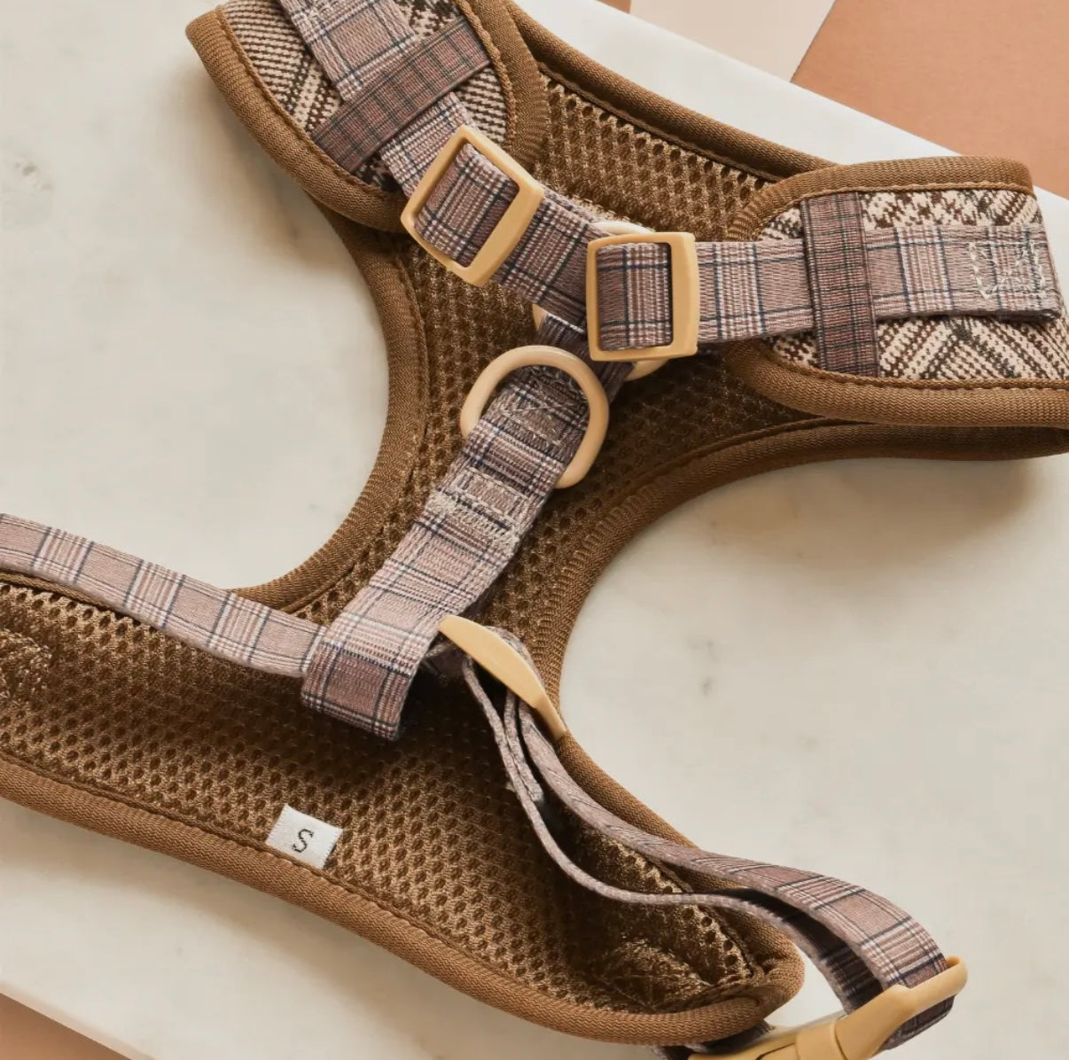 Verleihen Sie Ihrem Welpen mit dem verstellbaren Pup-Plaid-Nackengurt einen Hauch von ländlichem Charme. Das modische Tweed-Design in klassischem Schokoladenbraun-Tartan sorgt nicht nur für einen stilvollen Auftritt, sondern bietet dank des integrierten Sicherheitsschlosses auch zuverlässigen Schutz. Perfekt für einen Spaziergang mit extra Stil!