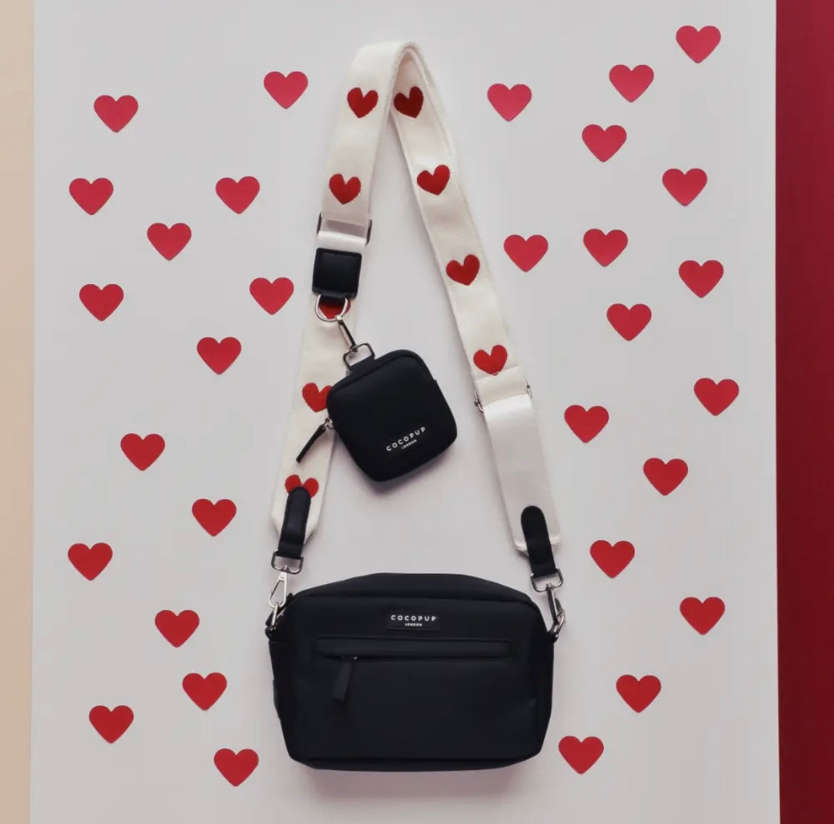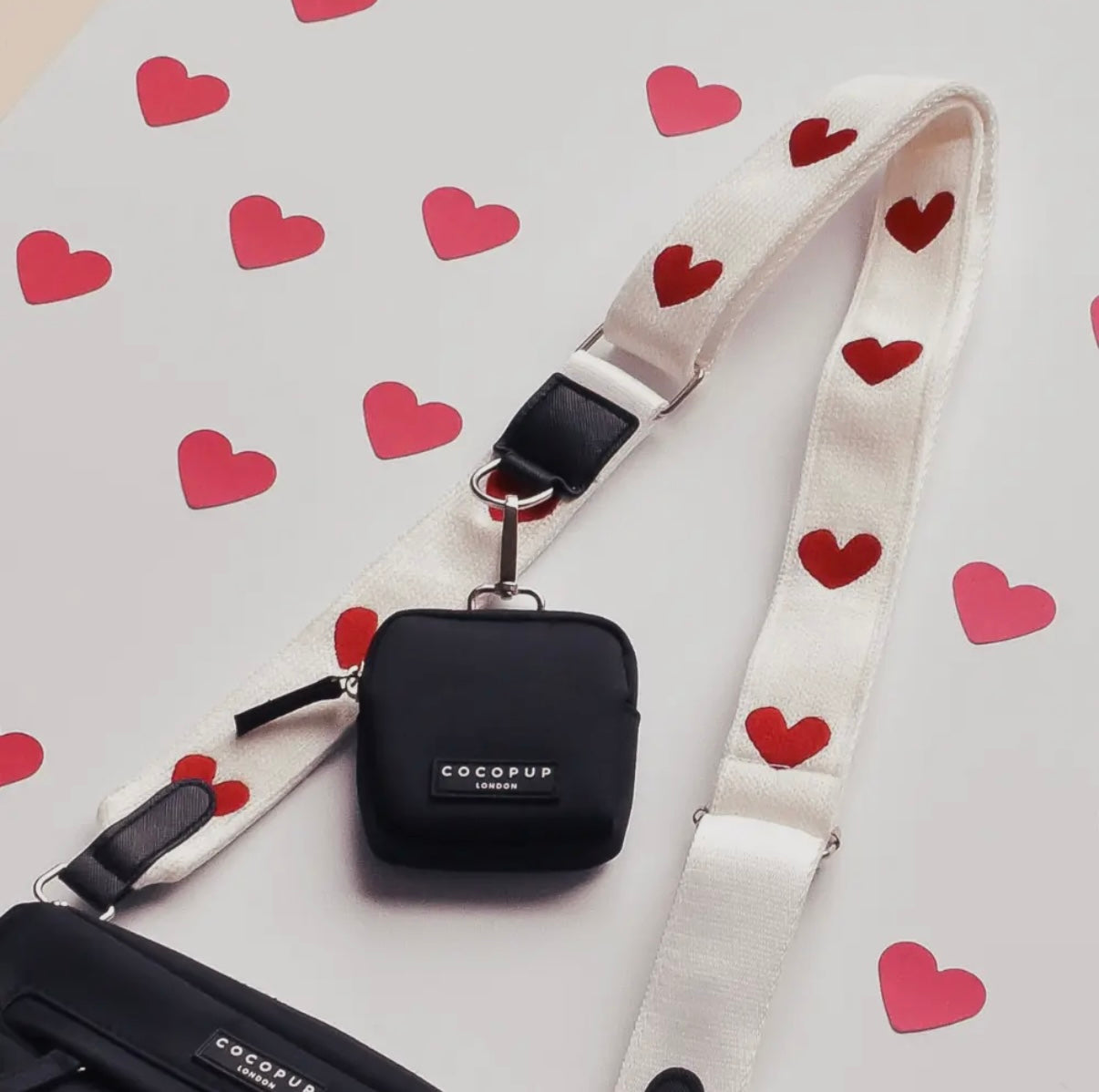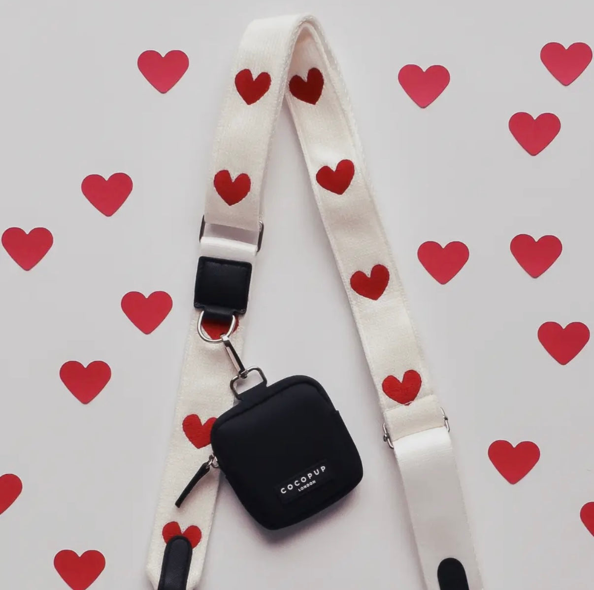 Spaziere mit deinem Hund stilvoll und herzlich! Der weiße Bag Strap aus gemütlichem Strickstoff mit niedlichem roten Herz-Design ist perfekt für Valentinstag oder jeden Spaziergang, bei dem dein Vierbeiner die Liebe spüren soll.