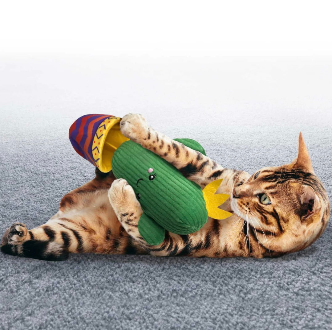 Der kuschelige Kaktus mit Katzenminze regt zum Toben und Umarmen an. Kaktus und Topf sind durch ein Gummiband verbunden, sodass das Spielzeug auseinandergezogen werden kann, ohne dass Teile verloren gehen. Knistergeräusche und optionales Befüllen mit Leckerlis sorgen für zusätzlichen Spielspaß.