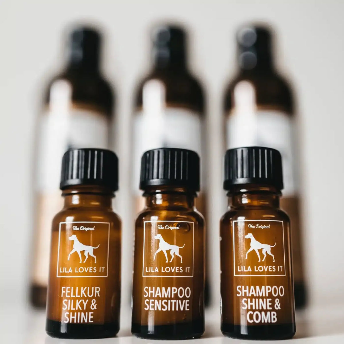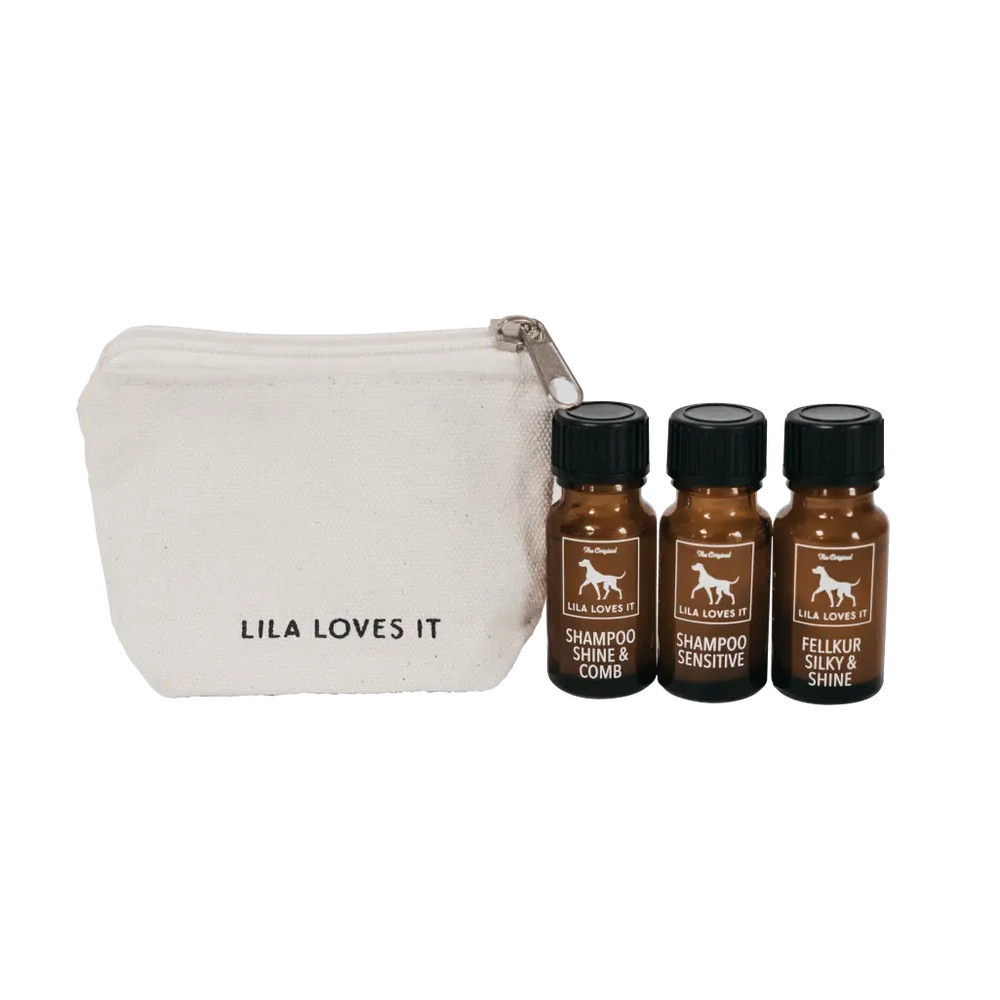 Eine perfekte Kombination: Das SHAMPOO SHINE & COMB die FELLKUR SILKY & SHINE und das SHAMPOO SENSITIVE in der Kleingröße 10 ml pflegen das Hundefell perfekt und garantieren gesunden Glanz. Die kleinen Flaschen passen in jedes Reisegepäck. Schick verpackt, sorgen die beiden Spitzenprodukte auch als kleine Aufmerksamkeit für große Freude. Typisch LILA LOVES IT.