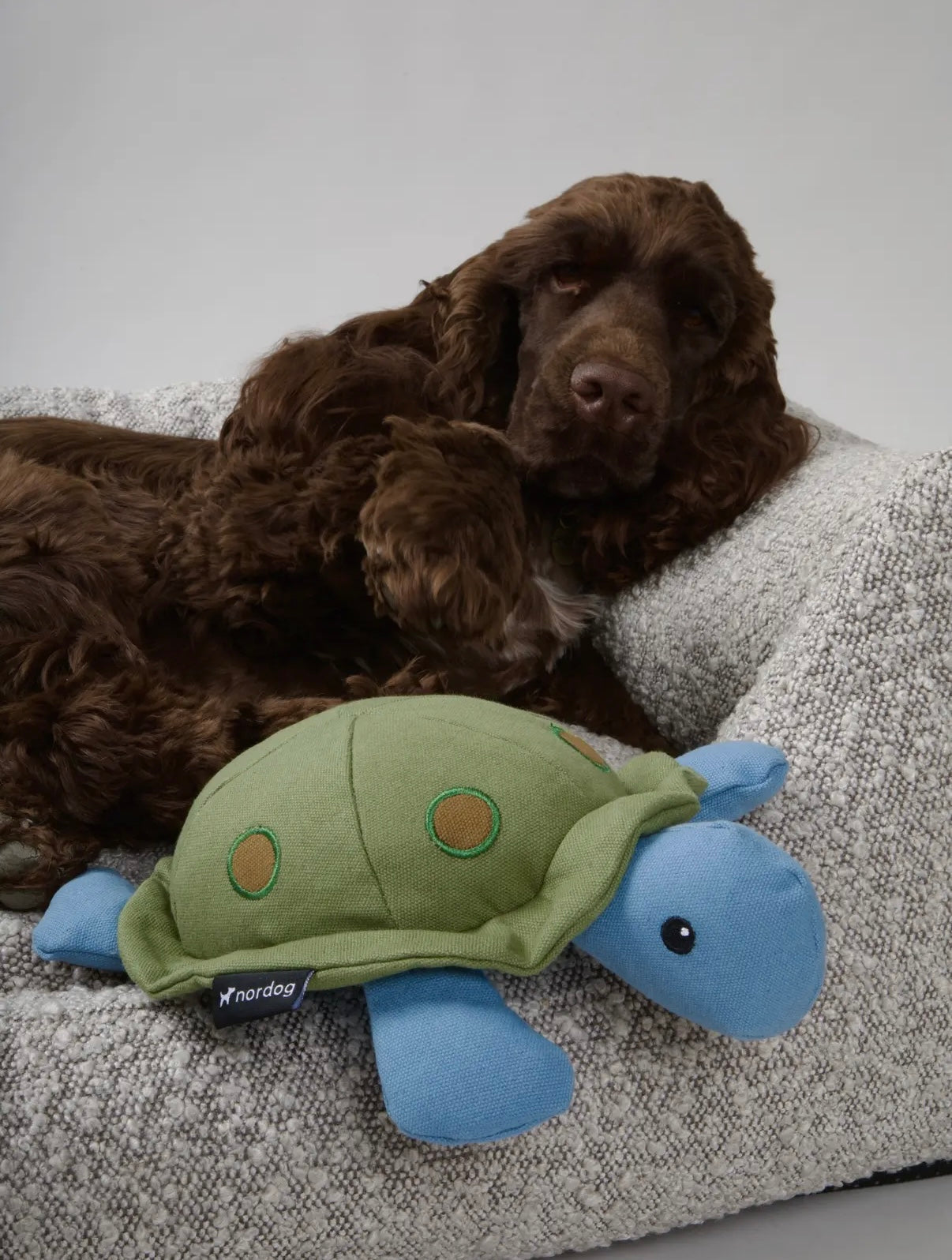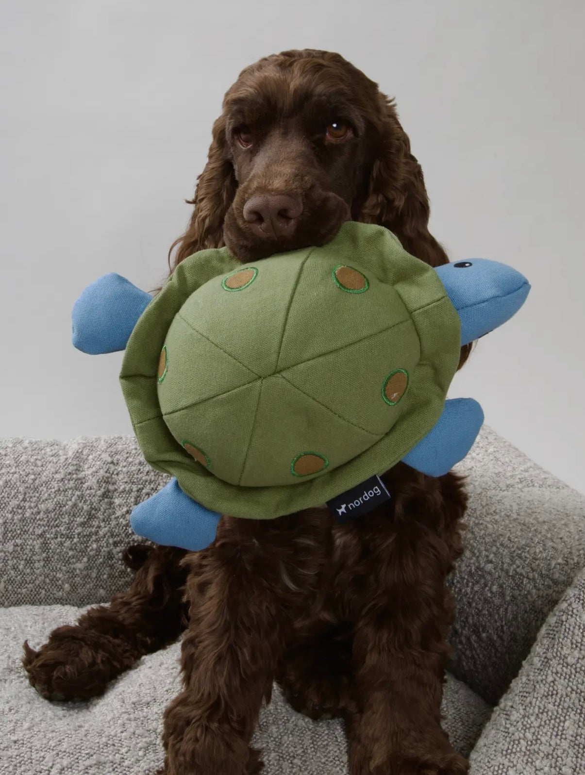 Kim von Nordog ist die schnellste Schildkröte im Spielzeugkorb. Gefertigt aus robustem Segeltuch, doppelt vernäht und ausgestattet mit einem integrierten Quietscher, sorgt Kim für ausgelassenen Spielspaß bei kleinen und mittelgroßen Hunden.