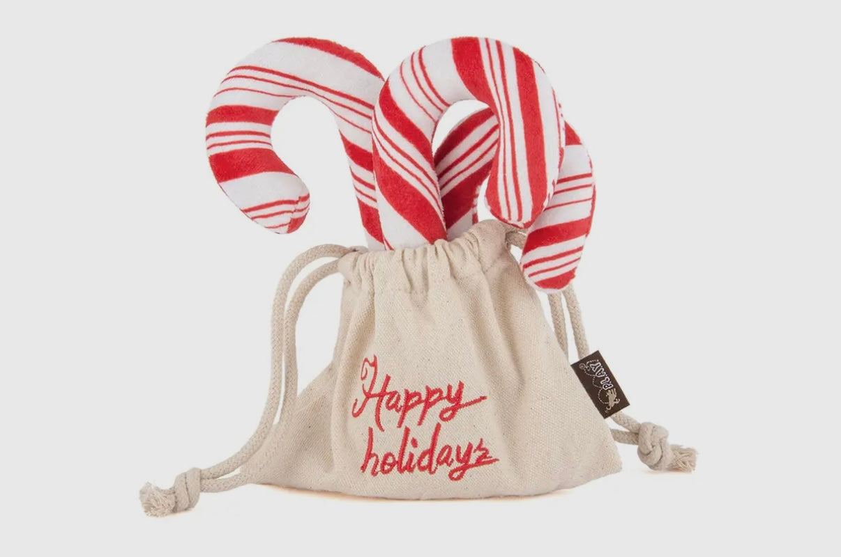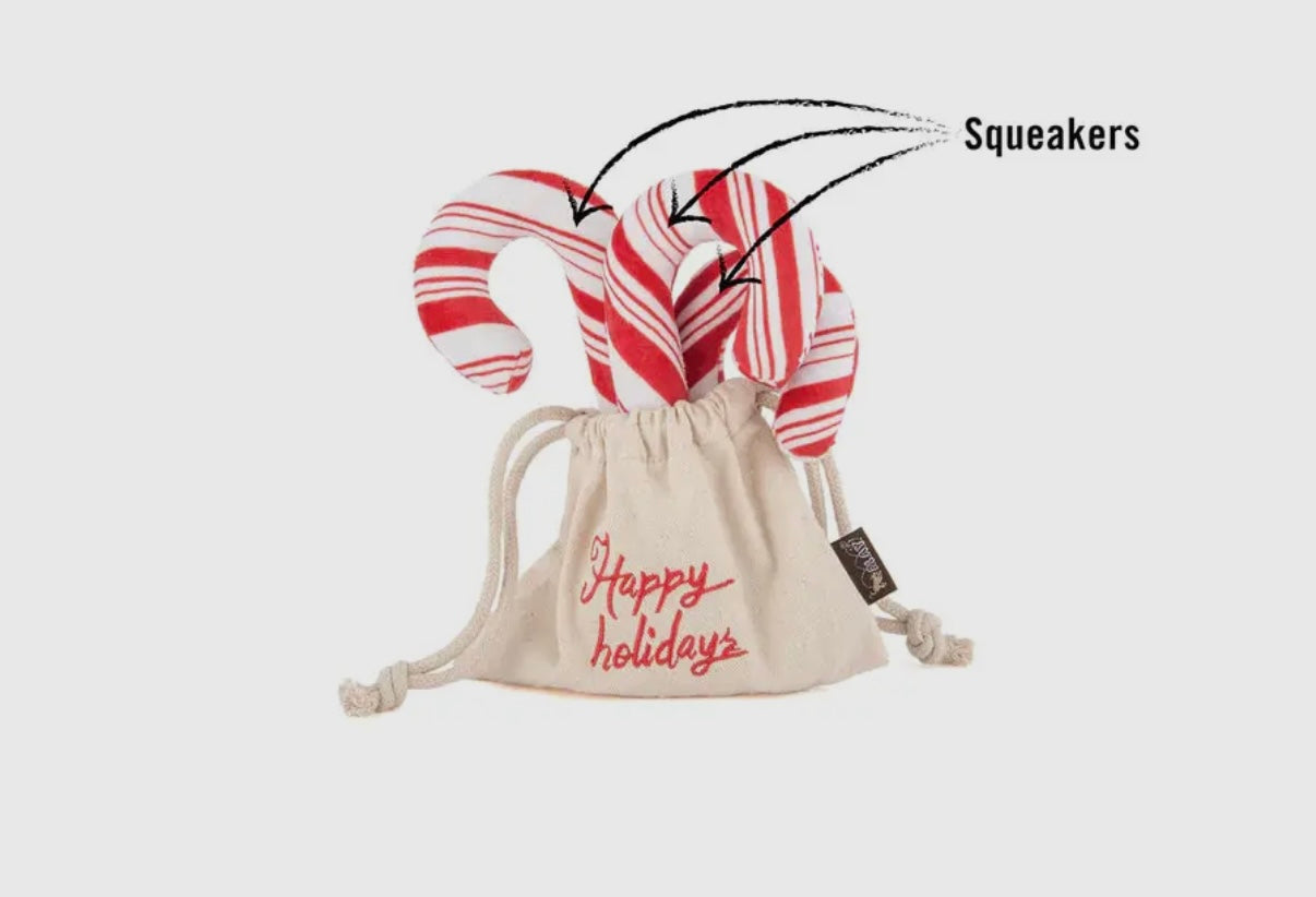 Überraschung am Weihnachtsmorgen! Die Cheerful Candy Canes aus der Holiday Classic Collection von P.L.A.Y. sind das perfekte Geschenk für deinen vierbeinigen Freund. Drei plüschige Zuckerstangen, jede mit eigenem Squeaker, sorgen für interaktiven Spielspaß und festliche Stimmung direkt zu Hause.