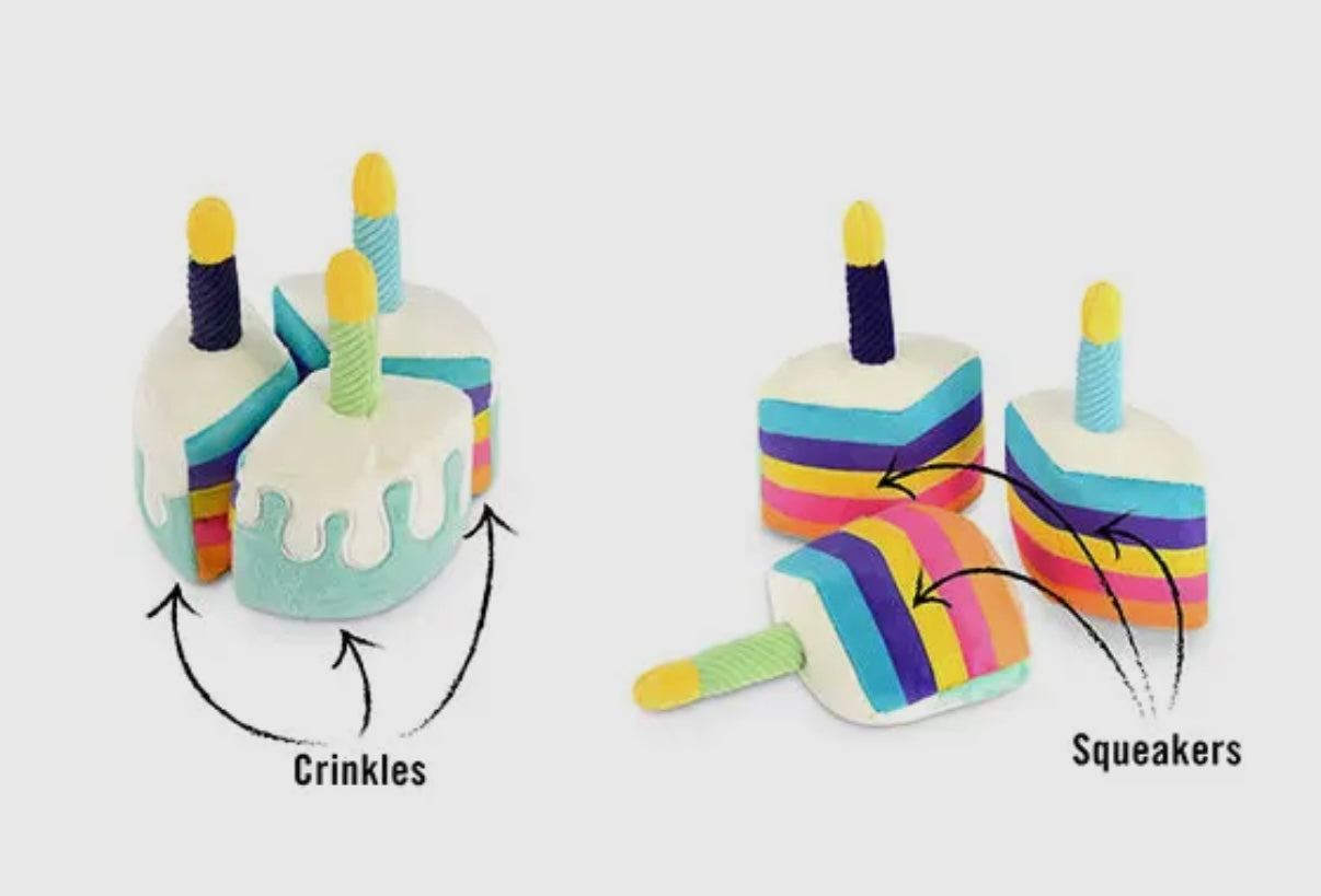 - Teilbar & knisternd: Drei Tortenstücke mit Knistern und Quietschern für extra Spielspaß