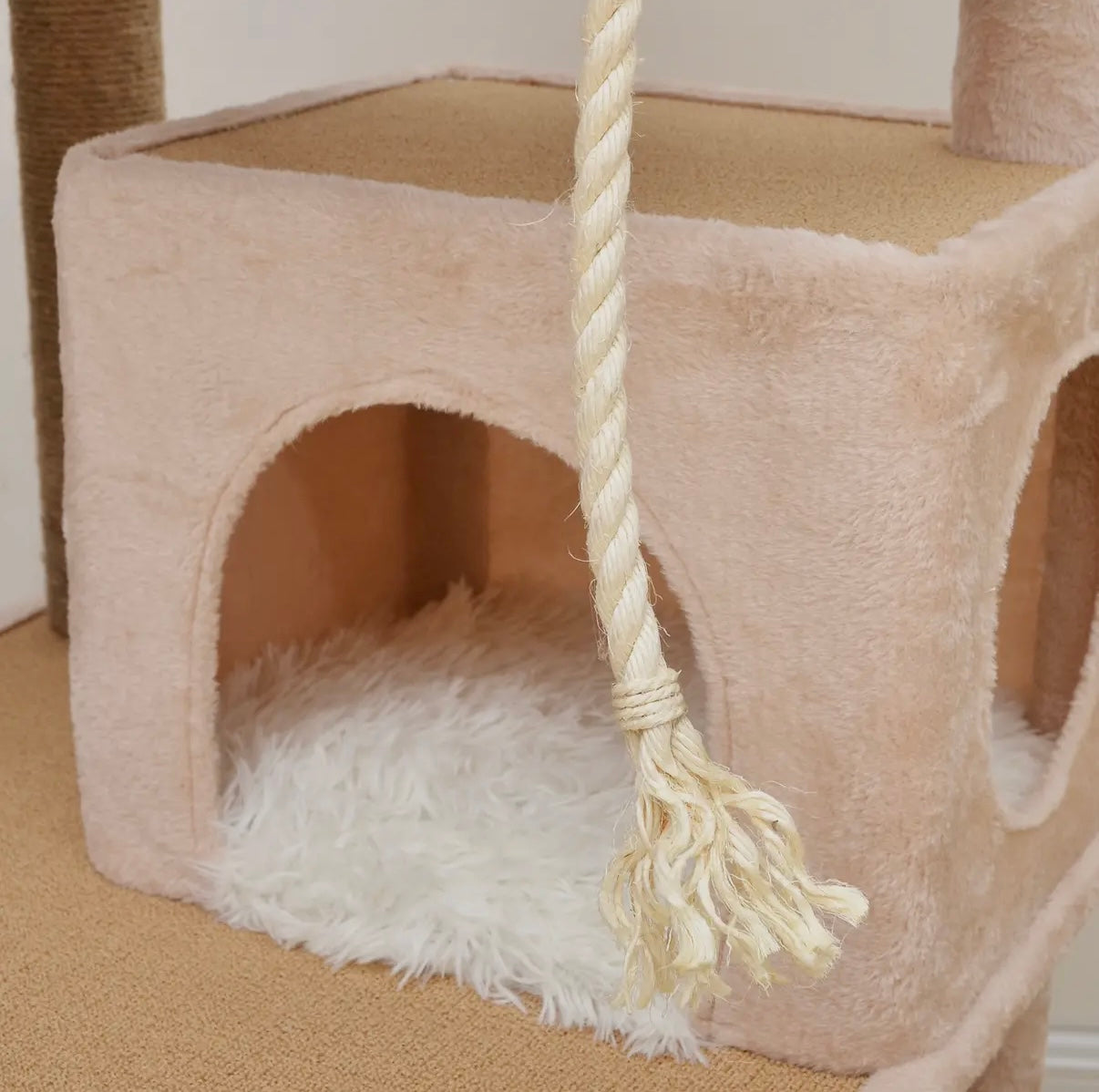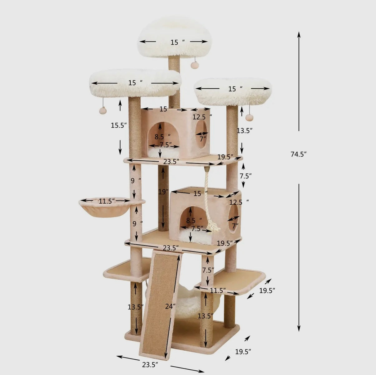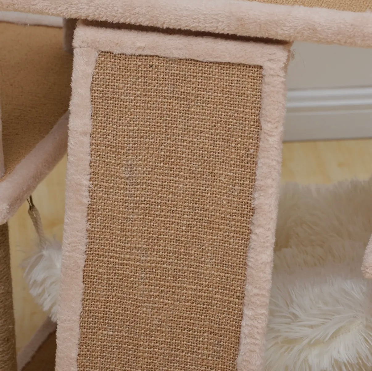 Dieses Katzenschloss ist ein wahres Paradies für eine oder mehrere Katzen. In einem hellbeigen und cremefarbenen Farbschema fügt es sich harmonisch in jedes Zuhause ein und bietet auf 8 Ebenen vielseitige Möglichkeiten zum Spielen, Entspannen und Kratzen.