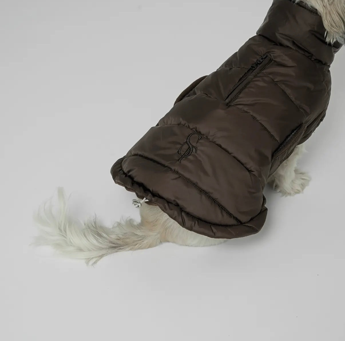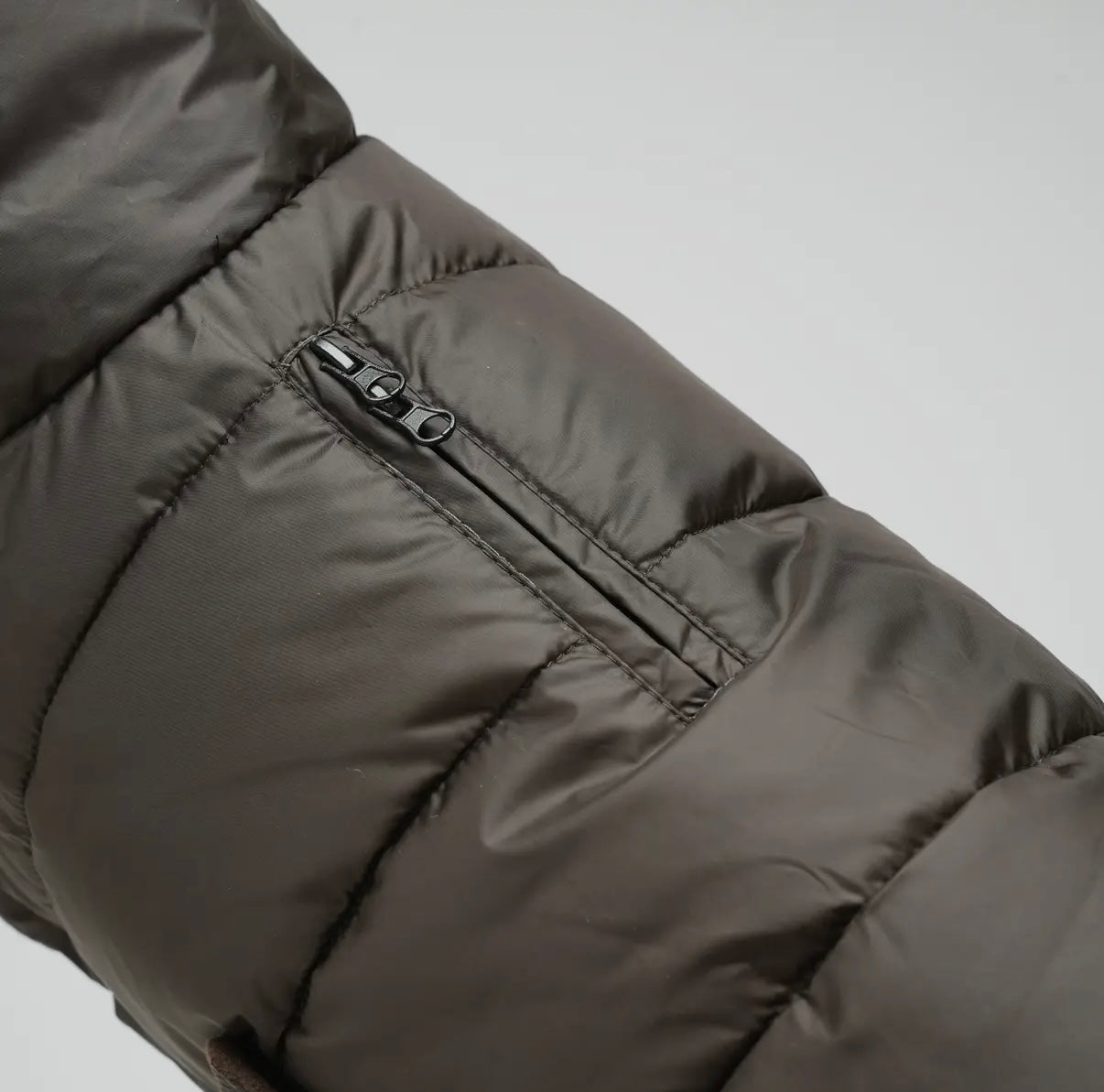 Warmer Wintermantel aus weicher Daune und Fleece, der Komfort, Schutz und Stil vereint. Wasserabweisendes Außenmaterial hält Ihren Hund trocken, während die reflektierende Schicht für bessere Sichtbarkeit sorgt. Dank breiter Klettverschlüsse und Kordelzug lässt sich die Jacke einfach anlegen, ohne die Pfoten anheben zu müssen. Optional sind elastische Beinriemen für zusätzliche Stabilität.