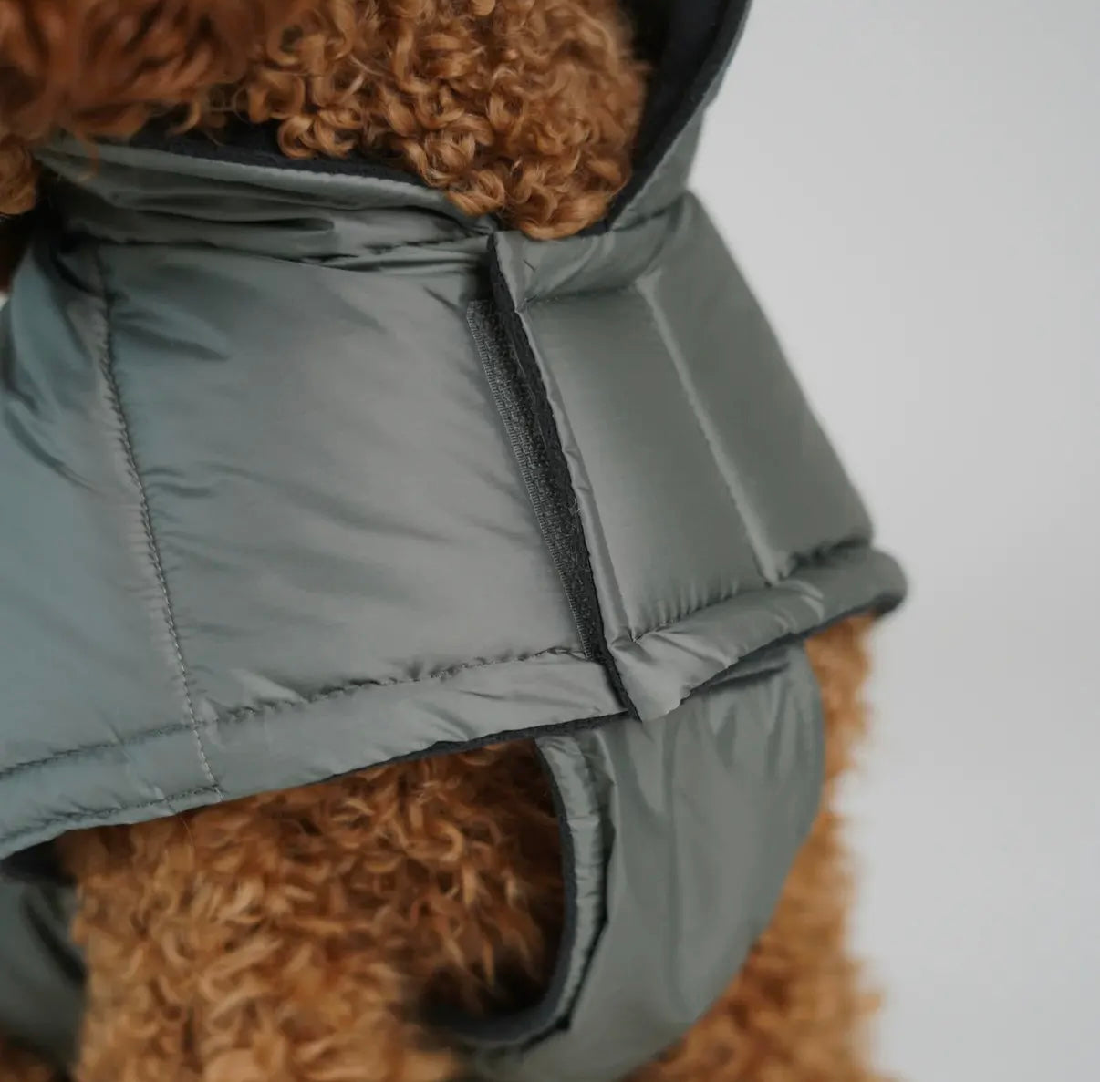 Warmer Wintermantel aus weicher Daune und Fleece, der Komfort, Schutz und Stil vereint. Wasserabweisendes Außenmaterial hält Ihren Hund trocken, während die reflektierende Schicht für bessere Sichtbarkeit sorgt. Dank breiter Klettverschlüsse und Kordelzug lässt sich die Jacke einfach anlegen, ohne die Pfoten anheben zu müssen. Optional sind elastische Beinriemen für zusätzliche Stabilität.